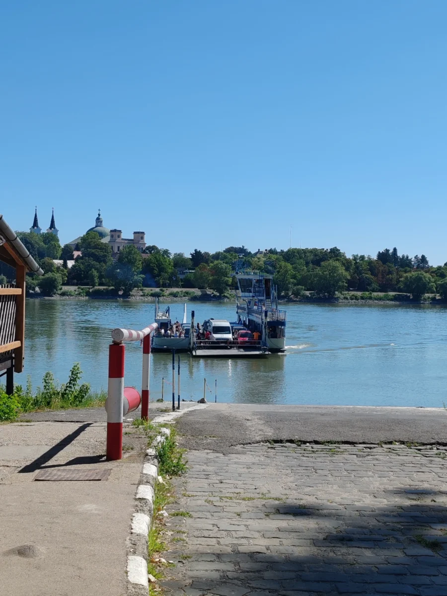 Circulábamos por una carretera bastante transitada, siguiendo paralelos al río Danubio por el lado izquierdo tal como marcaba nuestro track, pero las señalizaciones del Eurovelo nos indicaban desviarnos por un puente en otra dirección. Como la carretera por la que íbamos estaba muy concurrida, decidimos seguir la ruta del Eurovelo y cruzar el puente. Tras unos pocos kilómetros llegamos a un pequeño puerto, donde había que tomar un ferry para continuar hacia la población de Vác, al otro lado del río. Al llegar, la taquilla estaba desierta y vimos el barco en la otra orilla. Según el horario, entre mayo y septiembre los ferries deberían ser más frecuentes… pero mientras estuvimos allí nos dio la sensación de que ese horario no se cumplía del todo. Al menos, ese día no se cumplío.