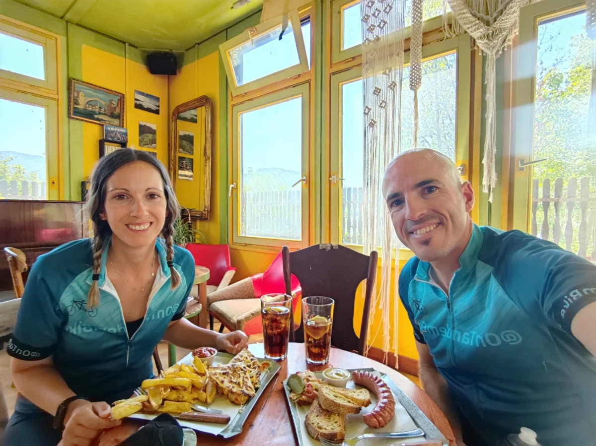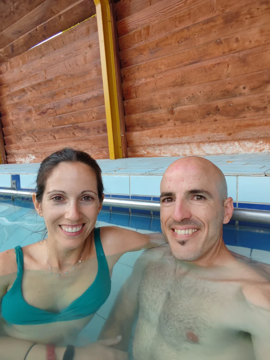 Camping Solaris 36,60 € (1 tienda, 2 personas). Nos alojamos en este camping que incluía la entrada a los baños termales, lo que fue una auténtica maravilla después de pedalear todo el día. Las parcelas eran amplias y cómodas para montar la tienda sin problemas. No usamos las duchas del camping porque utilizamos las de los baños termales (ojo porque ¡algunas son de agua caliente y otras de agua fría!) pero los baños en general estaban muy limpios y bien cuidados. Además, había mesas exteriores y una cocina compartida con fogones y nevera en una sala interior, perfecta para preparar la cena mientras nos resguardábamos del fresquito de la noche.