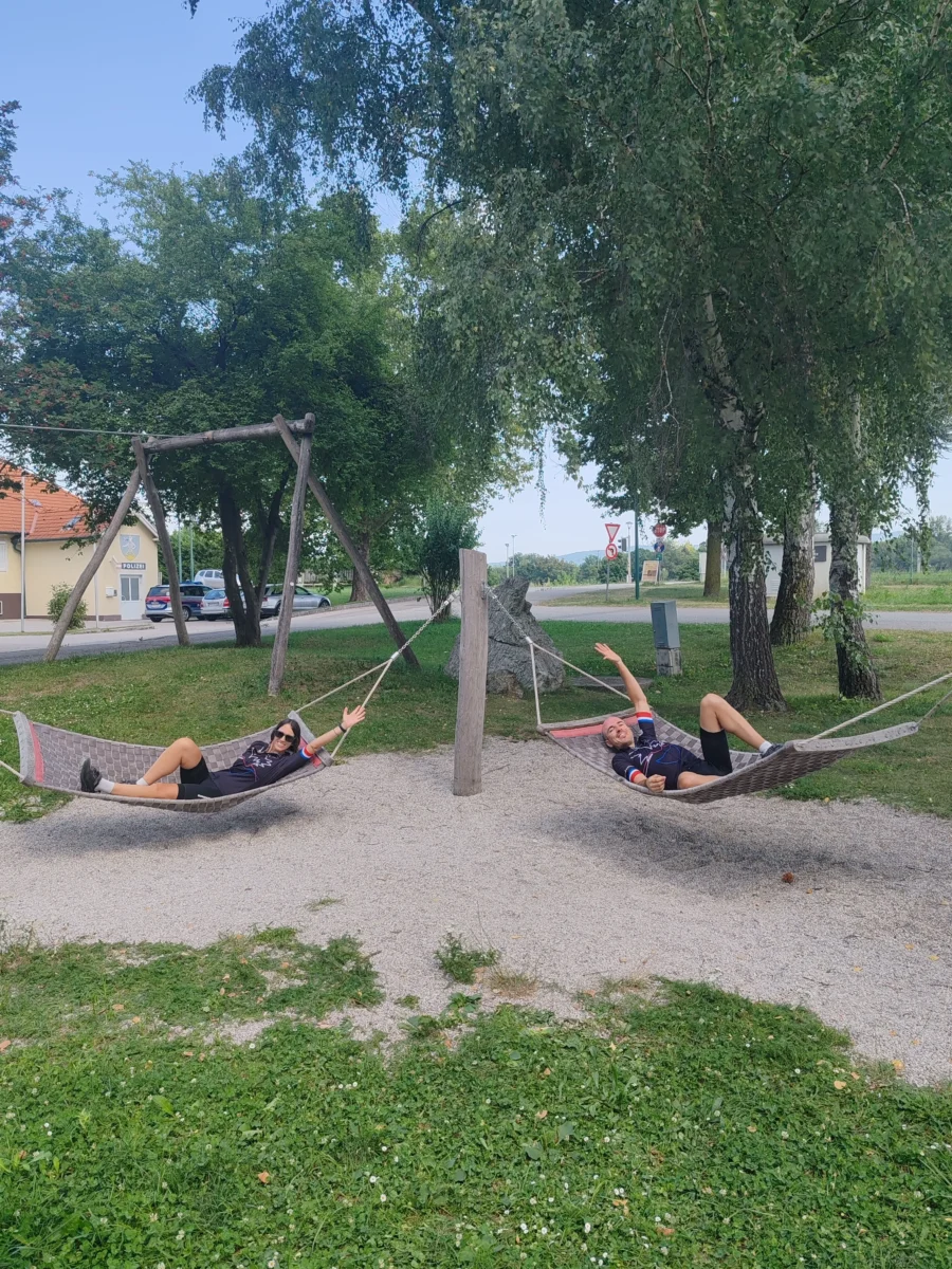 En ningún momento tuvimos problemas para encontrar agua, hay muchas fuentes y también baños públicos en los parques, lo cual se agradece mucho en una jornada de calor. En Erlach paramos a comer en un parque muy cómodo, preparamos nuestro pícnic y después nos tumbamos en unas hamacas a descansar un rato.