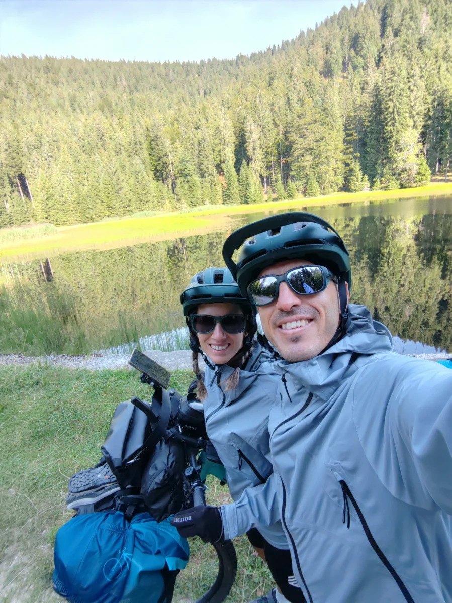 Hoy nos despertamos un poco más tarde de lo habitual, sobre las 7:00h, desayunamos con calma y a las 8:20h ya estamos listos en la puerta del refugio. Antes de partir, nos despedimos y charlamos un rato con los profesores eslovenos, que desde ayer no podían dejar de alucinar con nuestro tándem y se acercaron una vez más para intercambiar impresiones.