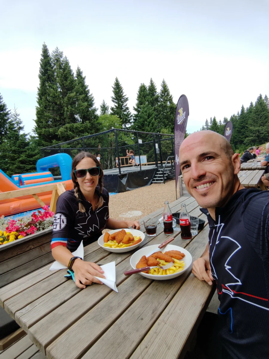 Al llegar al final de la pendiente, nos topamos de frente con un gran centro recreativo con restaurante, alojamiento, inflables y camas elásticas. Aunque era pronto, aprovechamos para hacer parada para comer. La comunicación con la camarera fue complicada porque no entendía nada de inglés (aunque la carta estaba tanto en esloveno como en inglés) y tampoco se mostró muy resolutiva. Finalmente acabamos pidiendo fingers de pollo con patatas.