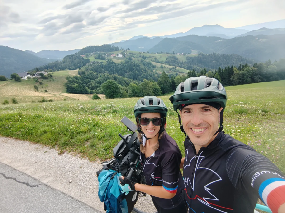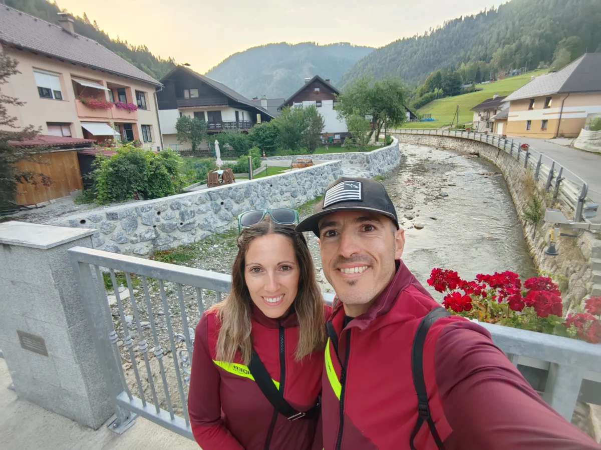 Al llegar a la cima de la última subida, merendamos los croissants y nos preparamos para la última bajada del día, directa a Črna na Koroškem, disfrutando de cada curva y de los paisajes de montaña que nos acompañan. Pasamos por los supuestos alojamientos del pueblo (según googlemaps), pero todos estaban cerrados. Por suerte, uno de ellos nos respondió por WhatsApp y, aunque tenían el alojamiento cerrado porque estaban fuera de vacaciones, nos ofrecieron acampar en su jardín. La zona de césped era amplia y cuidada, pero como el pronóstico anunciaba lluvias de madrugada, decidimos montar la tienda sobre el asfalto, bajo el techado del aparcamiento. Había enchufes exteriores, así que pudimos cargar los dispositivos y dejar todo listo para la jornada siguiente. Una solución improvisada que volvió a recordarnos que, en el camino, la hospitalidad aparece cuando más la necesitas.