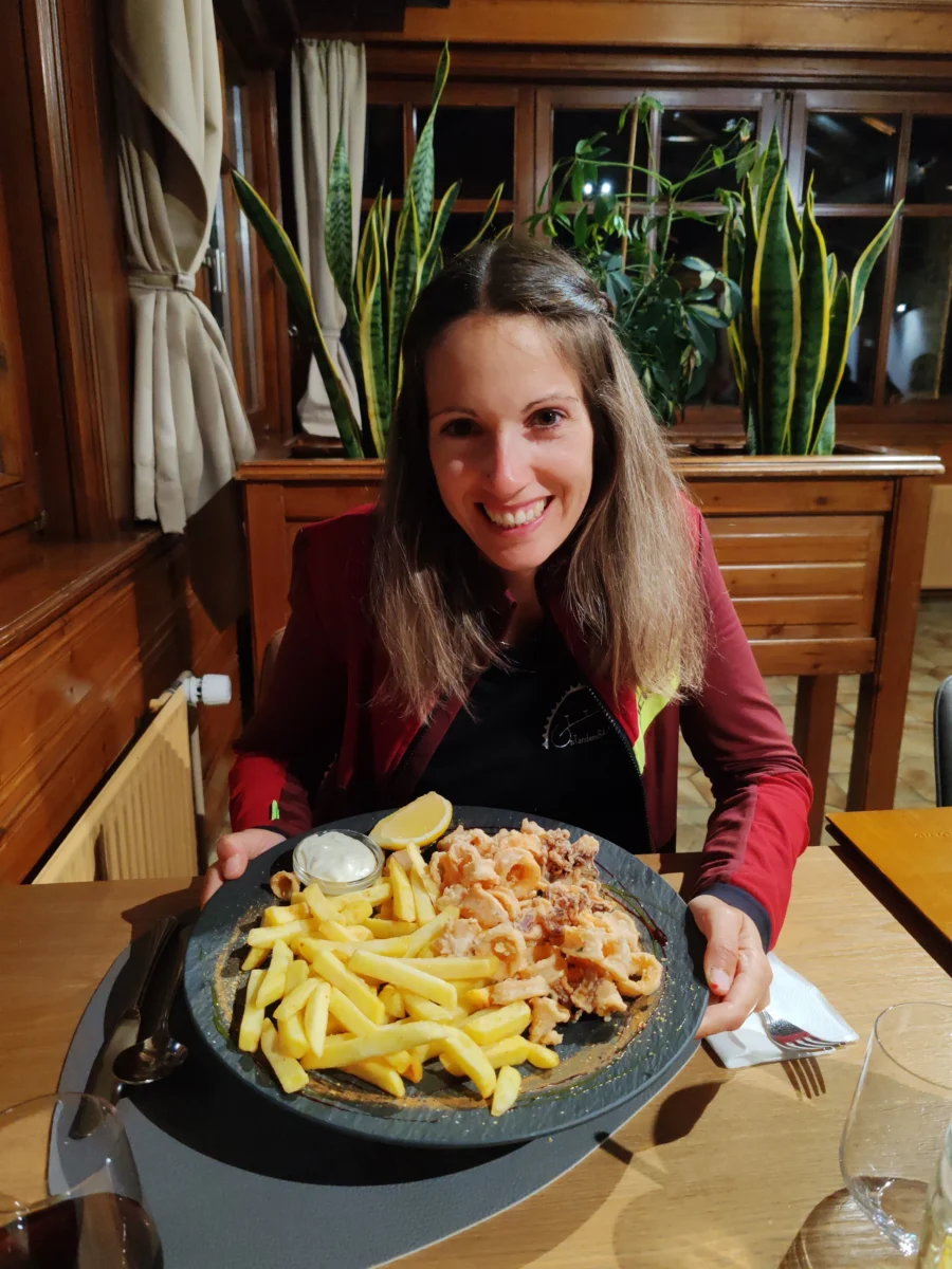 Una vez en el hotel, devoramos los boreks, nos dimos una ducha caliente que nos devolvió a la vida y disfrutamos de una tarde de descanso total para recuperar fuerzas. Sin ganas de volver a salir, decidimos cenar en el propio hotel: Judith se decantó por unos calamares con patatas, mientras que Raúl eligió un menú con pasta a la trufa, carne y patatas.