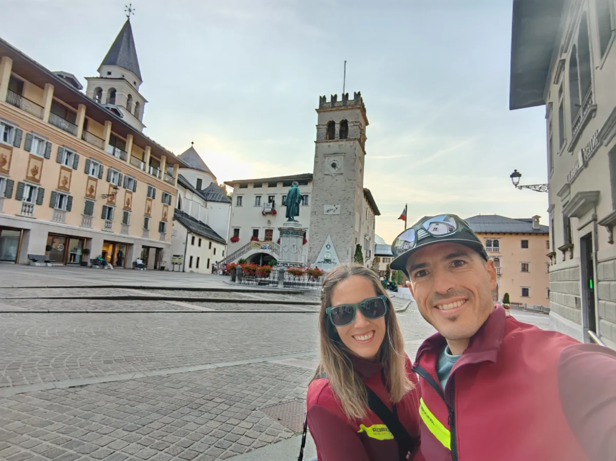 Al llegar a Cortina d’Ampezzo, dejamos el carril bici para adentrarnos en el pueblo. Cortina, conocida como la “Reina de los Dolomitas”, es un enclave elegante, rodeado de cumbres majestuosas. Sus calles están llenas de cafés, tiendas de montaña y hoteles con encanto, y aún conserva ese aire de estación alpina clásica. Paseamos un rato, disfrutando de su ambiente animado, aunque volver a la vía verde nos costó una buena subida.