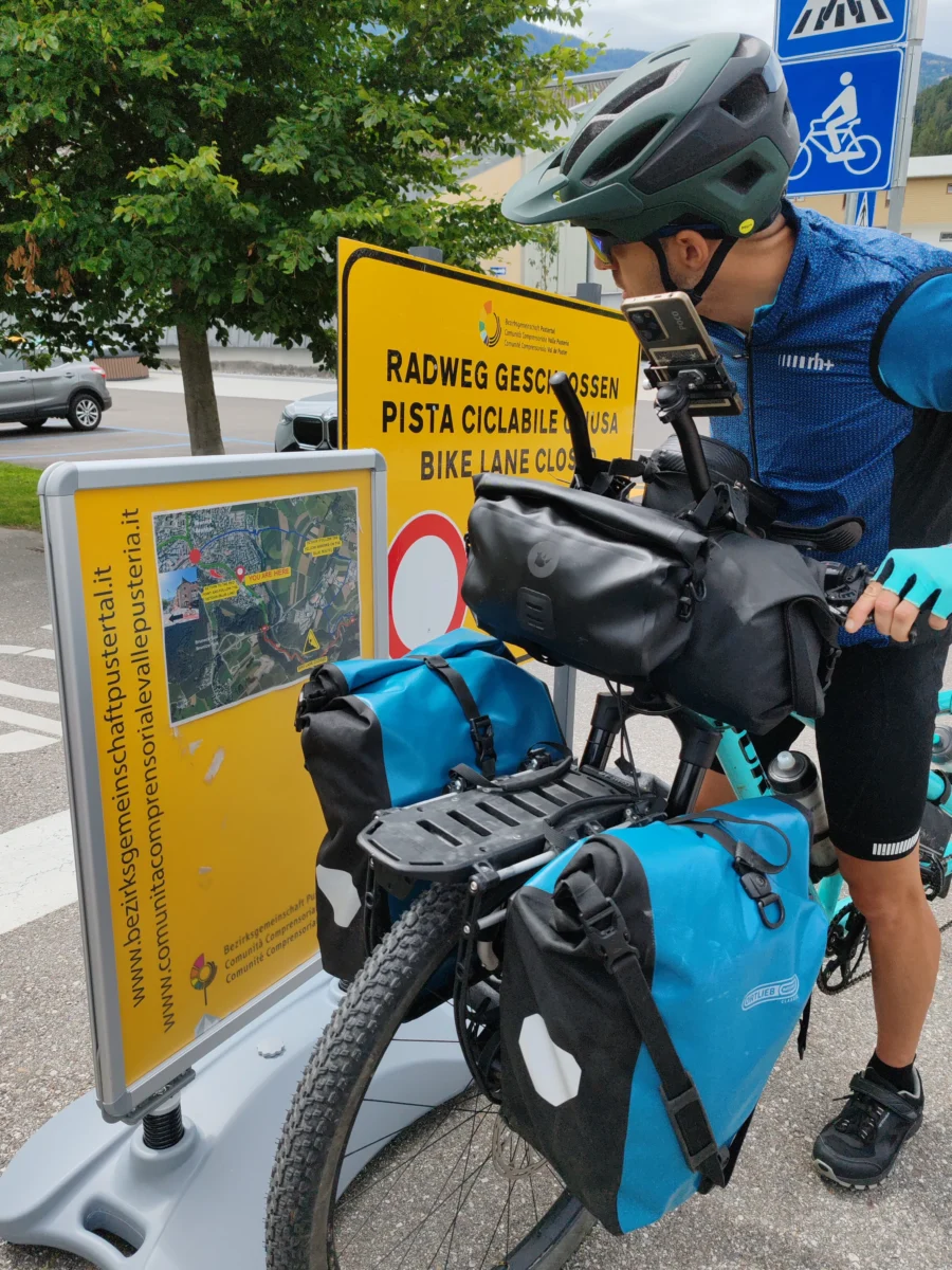 - Revisa si siguen las obras a la salida de Brunico. Si el tramo del carril bici sigue cortado, tendrás que seguir el desvío, como hicimos nosotros. Está bien señalizado, pero tiene más pendiente y menos interés.