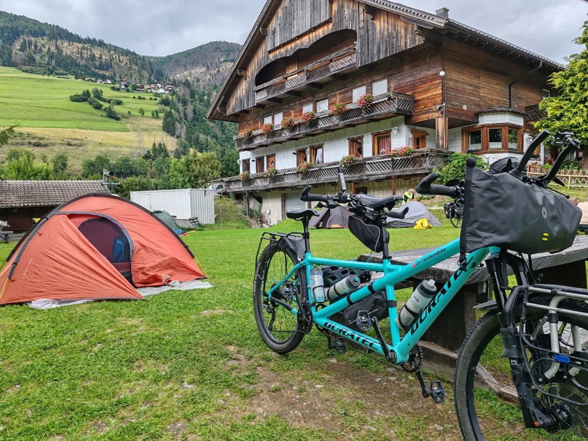 A las 16:00 h llegamos al Camping Lienzer Dolomiten, justo antes de entrar en Strassen. Las instalaciones eran muy buenas y enseguida montamos la tienda en la zona de acampada. Quitamos las alforjas y nos fuimos rápidamente al supermercado, a tan solo seis minutos en tándem.