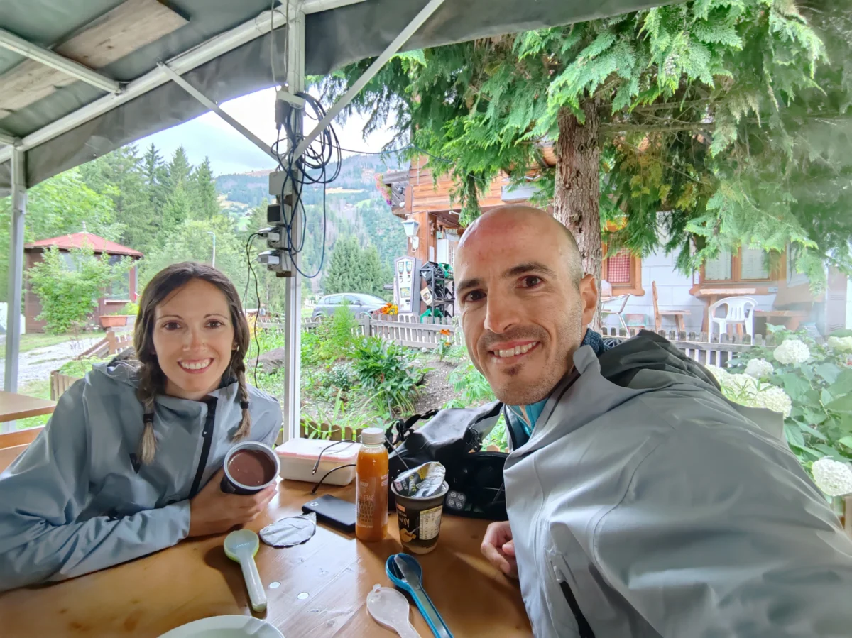 Nos despertamos a las 6:30 h. Se acabaron los desayunos de buffet: hoy tocaba algo más modesto, unos bocadillos en la tienda antes de empezar la jornada. Recogimos todo con calma y, sobre las 8:30 h, comenzamos a pedalear.