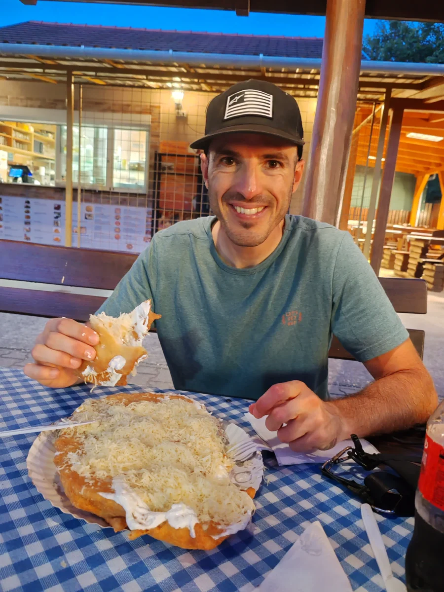 Acabamos el día probando los típicos «lángos«, un delicioso pan plano de masa frita, cubierto con crema agria y queso rallado, que se convirtió en el broche de oro perfecto y grasiento para una jornada intensa.