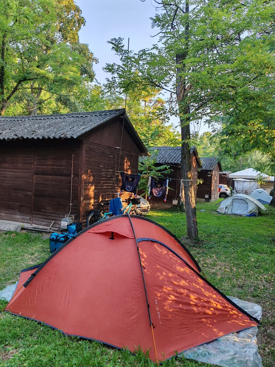 Aunque el camping no tenía muy buena pinta, viendo cómo se nos había complicado el final del día, no lo dudamos más: buscamos sitio y plantamos la tienda en un rincón que encontramos junto a una de las cabañas de madera.