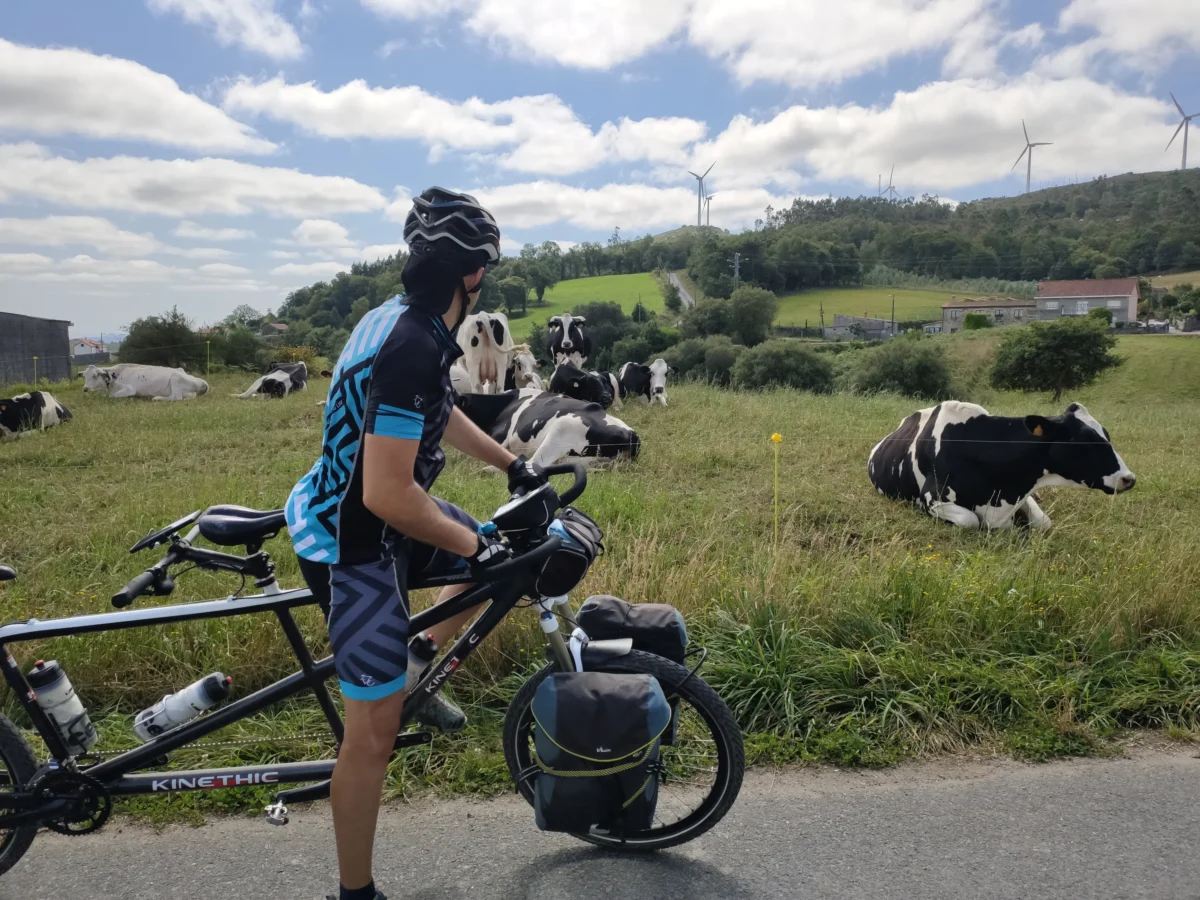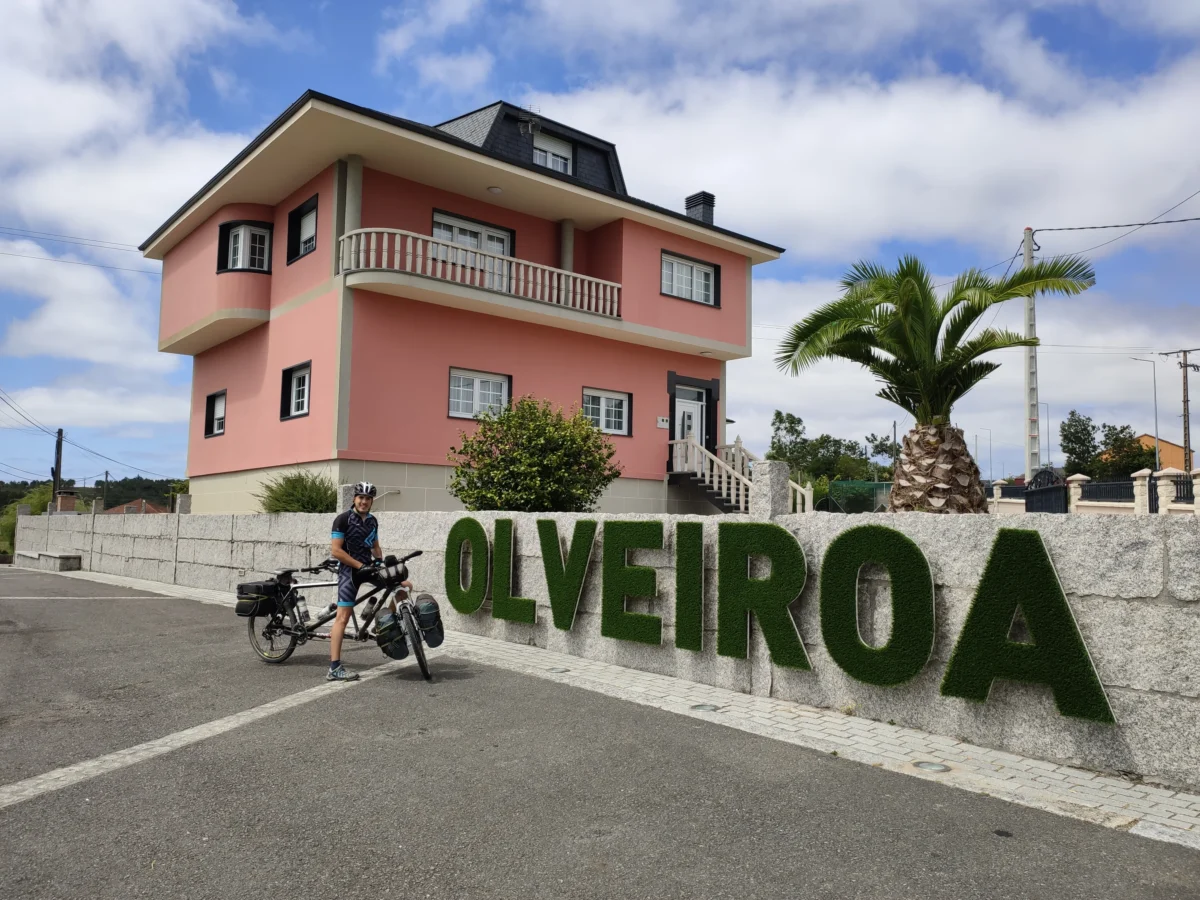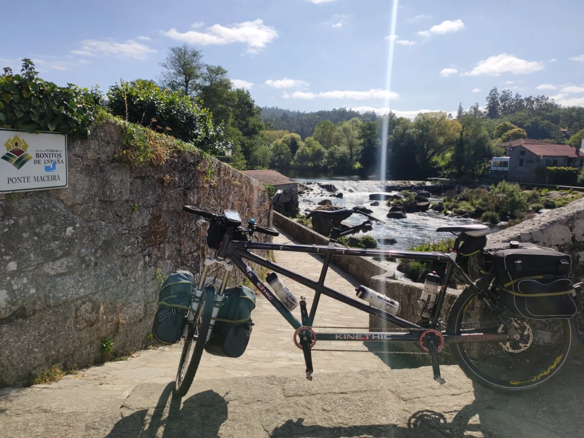 Pedaleamos por las calles aún adormecidas de Santiago, siguiendo las flechas amarillas que apuntaban hacia Muxía. La salida fue amable, con un suave descenso que pronto se convirtió en duro repechos. Galicia no entiende de llanos: aquí todo sube o baja, y el tándem nos exigía estar en tensión constante. Las cuestas pedían fuerza y las bajadas, concentración.