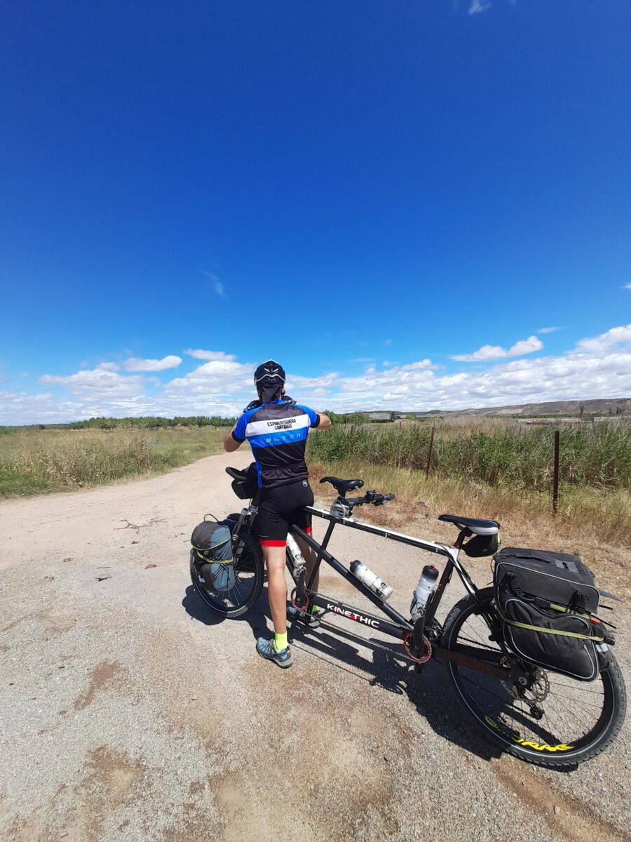 Pasadas las 10 de la mañana, cuando finalmente la lluvia nos dio una tregua, nos lanzamos a la carretera. La etapa era más corta que las anteriores, solo 48 kilómetros hasta Calahorra, lo que nos permitió tomarnos las cosas con más calma. Se notaban las piernas bastante cargadas del sobreesfuerzo realizado el día anterior: nunca habíamos hecho tantos kilómetros con el tándem, y menos con el peso del equipaje. El suelo seguía algo mojado, pero las condiciones habían mejorado lo suficiente como para pedalear con seguridad, así que avanzamos con precaución paralelos al río Ebro.