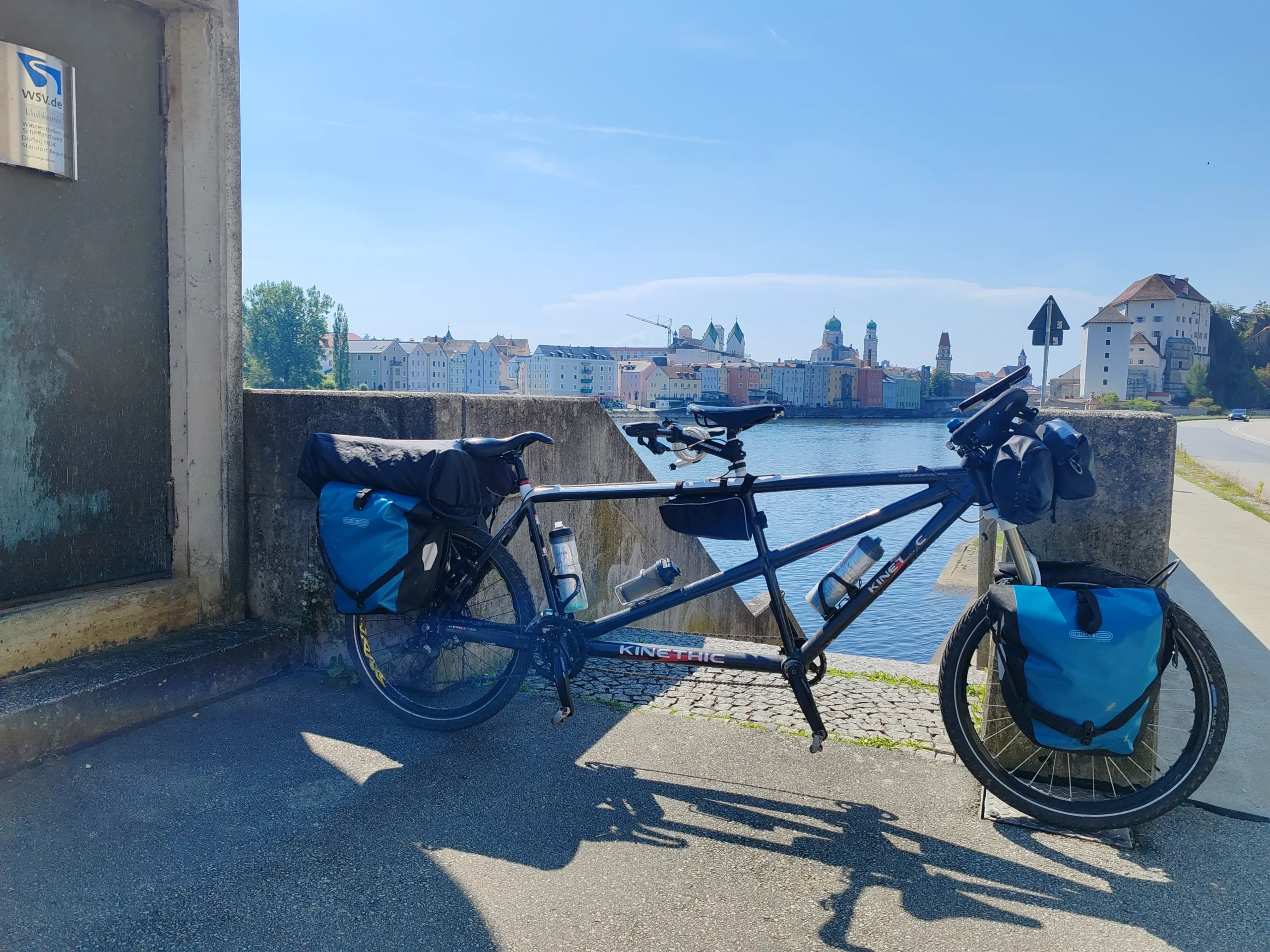 Por suerte, al rato la sensación se esfumó y finalmente, alcanzamos un camping a las afueras de Passau donde montamos el campamento. Una vez descargado el equipaje, volvimos a subirnos al tándem para explorar la ciudad con mucha más ligereza. Al ser festivo, desistimos de buscar el radio de repuesto y nos dedicamos a disfrutar de la confluencia de los tres ríos. Fue fascinante observar desde la punta de la península cómo el Danubio, el Eno y el Ilz funden sus aguas, cada una con una tonalidad distinta.