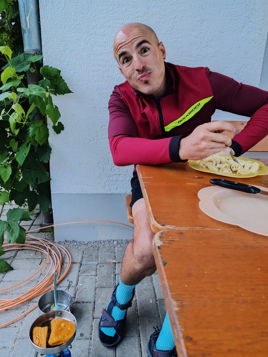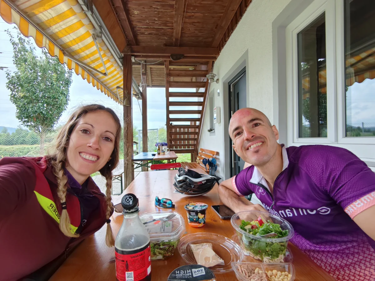 La logística de la comida estuvo totalmente condicionada por el clima. Compramos provisiones con la idea de parar antes de llegar a Cham, por la zona de Roding, pero como el tiempo estaba tan inestable preferimos seguir pedaleando para aprovechar que no llovía. Llegamos al club de canoa sobre las 14:00 h y nuestra prioridad fue montar la tienda y guardar las alforjas de inmediato; queríamos dejarlo todo listo y a cubierto antes de que pudiera empezar a llover de nuevo. Una vez asegurado el campamento, ya pudimos comer con tranquilidad en las mesas del club.