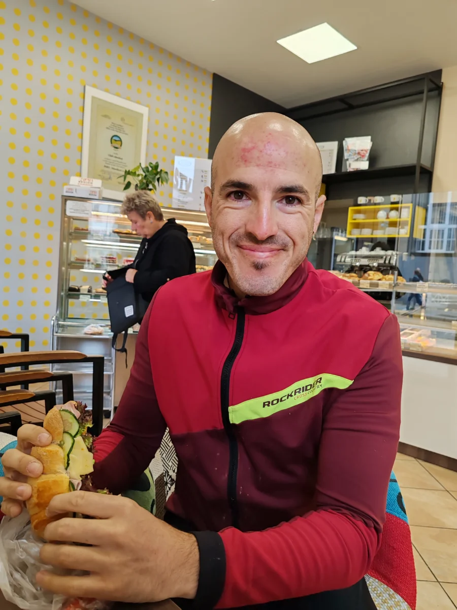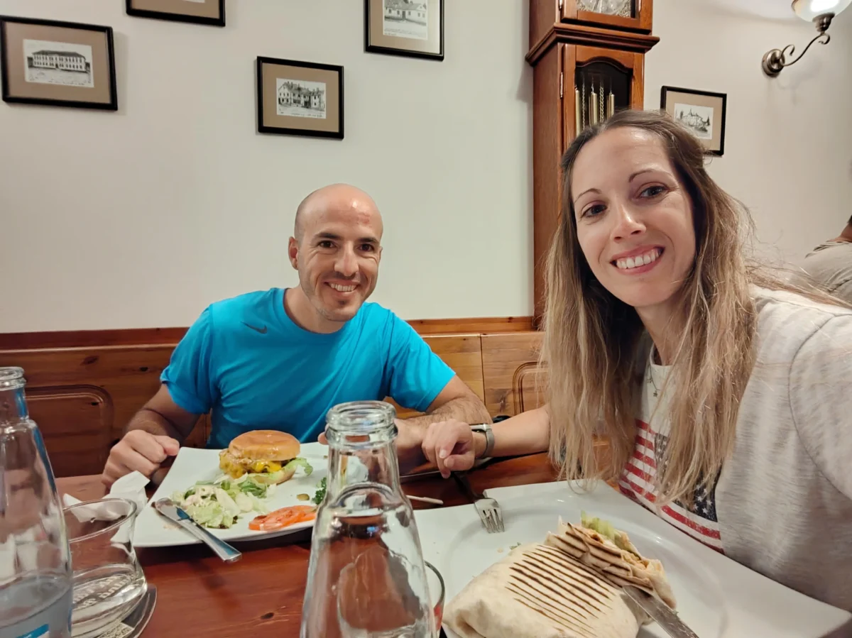 Tuvimos que subir de nuevo al tándem para llegar al restaurante más cercano, a unos 5 minutos de distancia. Aunque realmente estaba cerca, aquello nos dio muchísima pereza porque la temperatura había bajado hasta los 9 grados y, obviamente, seguíamos sin tener ropa de abrigo adecuada.