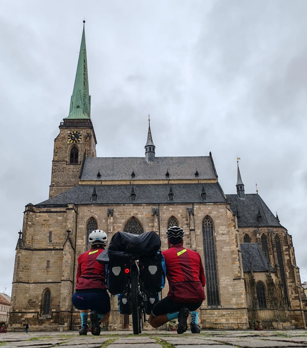 Seguimos en todo momento las marcas amarillas de la red ciclista checa en dirección nordeste, siempre bajo la guía del carril bici número 3, que nos sorprendió gratamente por lo bien señalizado que estaba. A mitad de jornada alcanzamos la bella y fría ciudad de Pilsen. Es justo en la ciudad donde el río Radbuza llega a su fin y desemboca en el río Berounka, que nace precisamente en Pilsen tras la confluencia de varios ríos. Como el termómetro seguía bajo, aprovechamos para refugiarnos en una cafetería y reponer fuerzas antes de continuar.