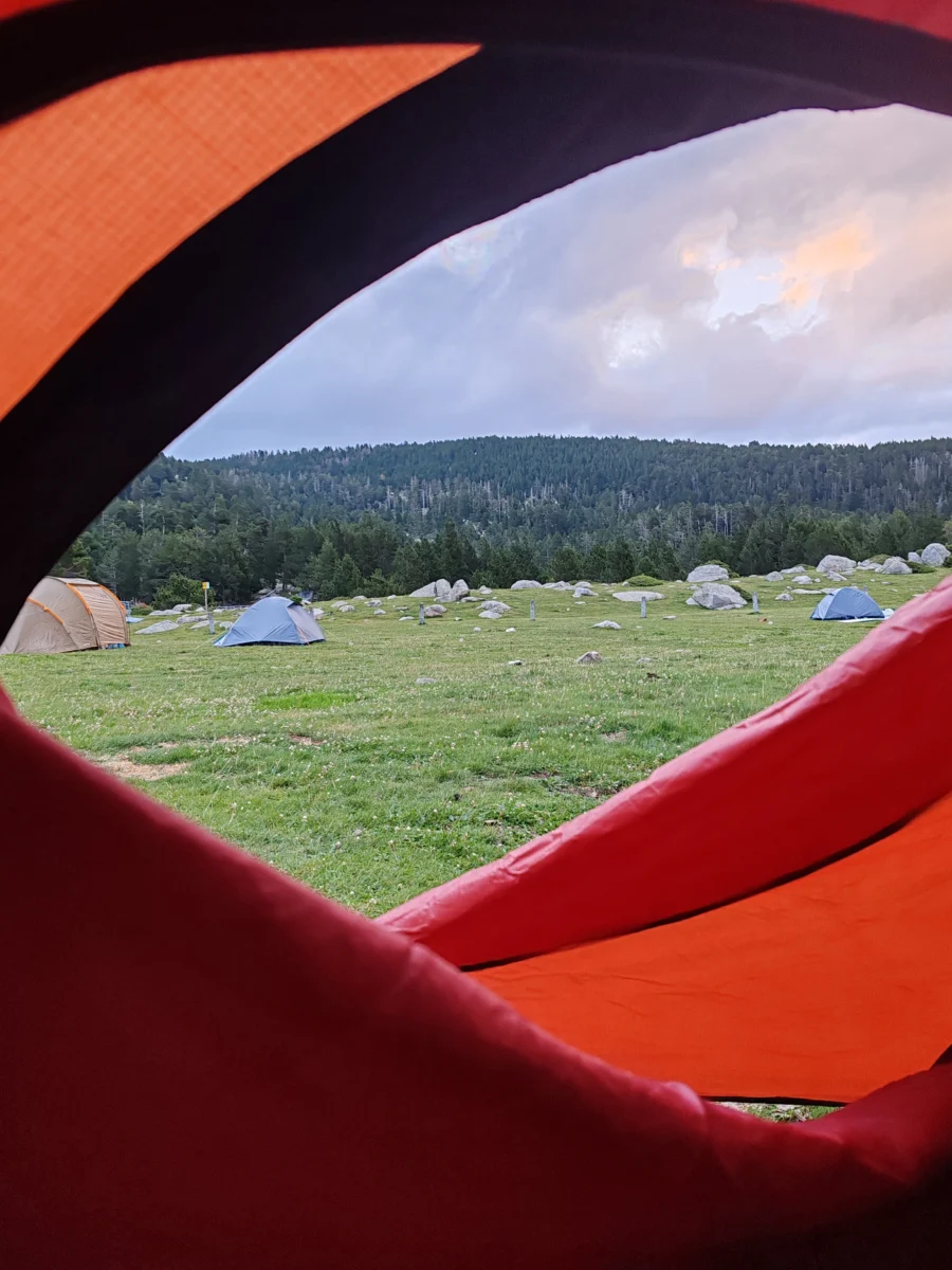 Montamos la tienda rápidamente y cenamos un bocadillo mientras escuchábamos las gotas golpear la tienda. Antes de las 23:30 ya estábamos con las luces apagadas, intentando dormir, pero el frío hacía difícil conciliar el sueño. La temperatura descendió por debajo de los 6 grados (a finales de julio), y aunque llevábamos ropa térmica y de abrigo, nuestro saco no era suficientemente cálido para estar cómodo esas temperaturas.
